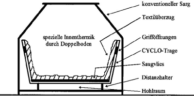 Ein einfaches und sicheres Transportmittel gewährleistet problemlose Umbettung undmacht aus jedem Sarg einen verbrennungsfördernden Doppelbodensarg